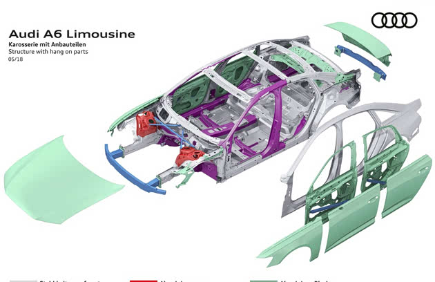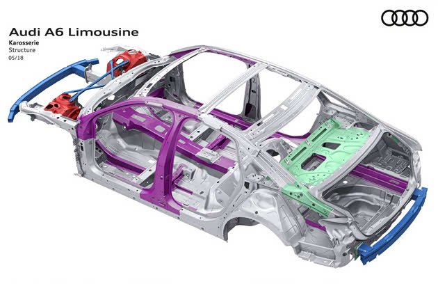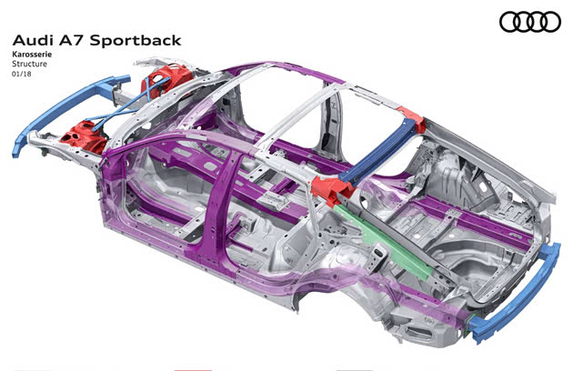 而为了弥补车身刚度上的损失,在A7C柱顶部采用了铸铝部件、后窗顶部横梁采用了与前后防撞梁相同的材料、C柱更是采用了铝材来提升刚度。这样一来,不仅工艺更加复杂,制造成本也上去了。