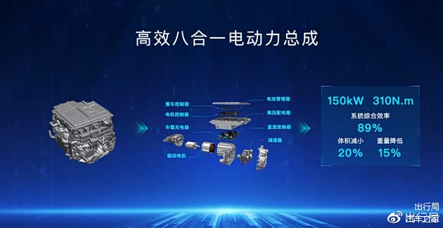 元PLUS诞生于比亚迪最新的e平台3.0,拥有八合一电驱动总成:集成驱动电机、减速器、驱动电机控制器、PDU(高压配电箱)、DC-DC(高低压直流转换器)、 Bi-OBC(车载充电器)、VCU(整车控制器)、BMS(电池管理器),系统综合效率达89%,相同功率下体积减小20%,重量降低15%。