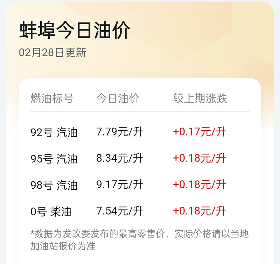 蚌埠今日油价: 92号汽油:7.79元/升 较上期涨0.17元/L 95号汽油:8.34元/升 较上期涨0.18元/L 98号汽油:9.17元/升 较上期涨0.18元/L 0 号柴油:7.54元/升 较上期涨0.18元/L