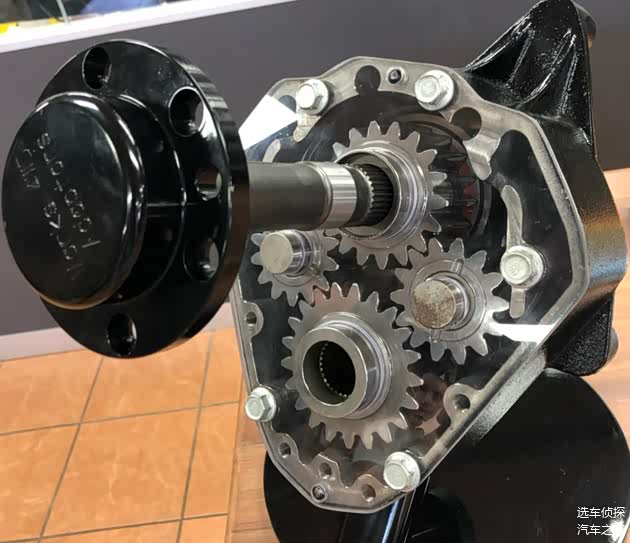 为何被称为“门式车桥”,顾名思义,车辆的整个车轴看起来像个门框,传统车辆的车轴都与轮胎的中心相连,形成一条直线,而门式车桥的车轴位于轮胎的上方,其中轴管或半轴偏离(通常在上方)轮毂中心,车轴的末端是一个更复杂的齿轮系统,通过齿轮,将旋转运动向下传递到车轮,根据齿轮箱大小,可以设计不同高度的门式车桥。