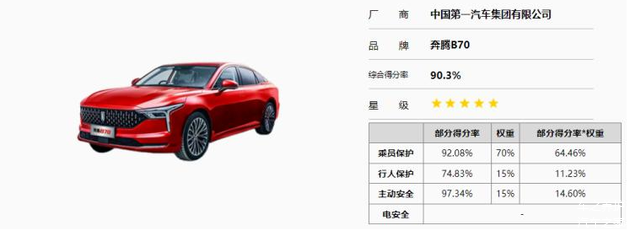奔腾B70的在“乘员保护”、“行人保护”、“主动安全”三大项的测试中均取得了优异的成绩,同时也从侧面证明了奔腾B70在车身被动安全性、主动安全性方面都有着出色的表现。在车身材料以及结构方面,奔腾B70采用的热成型钢占比达到了22%、高强度硬钢占比高达76%,坚硬的车身意味着奔腾B70比正常的汽车车身吸收更多的碰撞能量,材料强度大于1500MPa,能够有效保护车内乘客的安全。另外奔腾B70采用了具有自主知识产权的“双E”环形车身,在车辆发生碰撞后,冲击力经前后式贯通纵梁、门槛梁、中通道加强梁、地板纵梁及前围地板横梁等传递到整个车身,满足最高安全标准要求。在“乘员保护”大项测试中得到了92.08%的分数,无论是完全正面碰撞、正面40%碰撞还是侧面碰撞,奔腾B70都显得游刃有余,能够带给消费者十足的安全感。