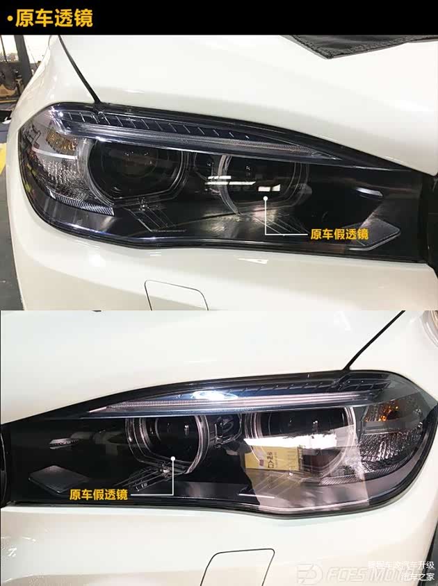 宝马X5原车大灯照明系统搭配的是略差的博士双光透镜,远光位是一对假透镜哦