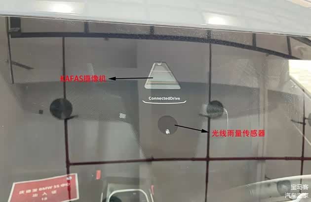 在前挡风玻璃最上方,能看见玻璃内侧的KAFAS摄像机和下面的光线余量传感器。