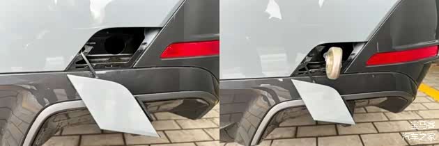 后保险杠右下方的小盖子是安装牵引环(拖车钩)用的。需按压盖边缘上的标记,然后将牵引环插入螺纹孔内,沿顺时针方向至少旋转5圈,使其完全稳定的选入即可。