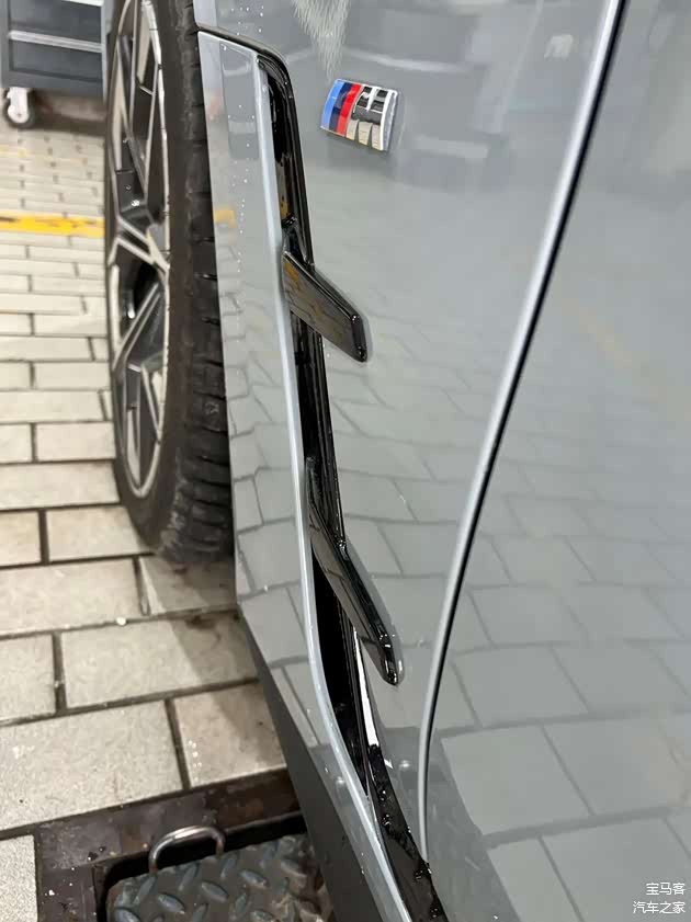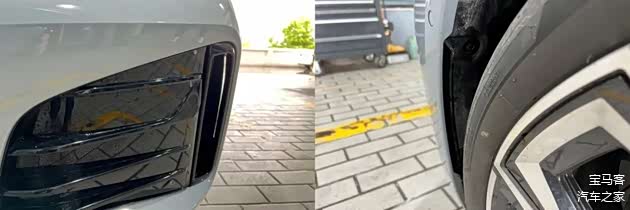 从前保险杠下部的空隙向里观察,能看见这台i4带有主动进气格栅。格栅打开的时候应该是给电池散热。格栅关闭的时候能降低风阻。