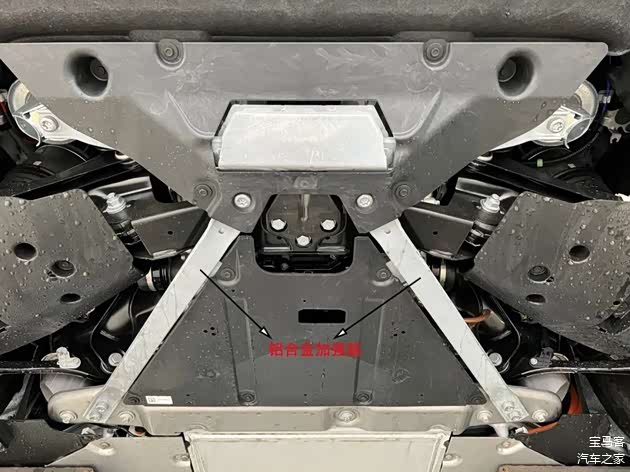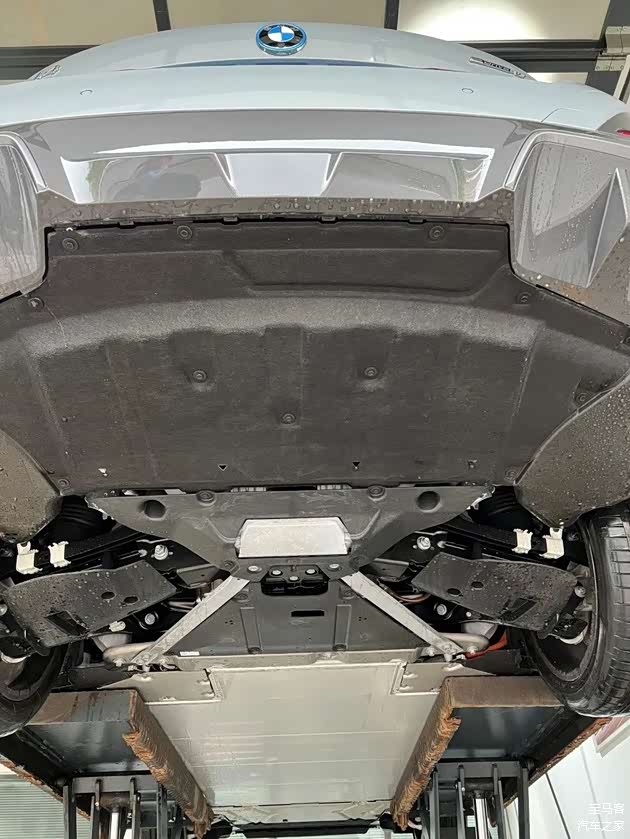 车辆底盘的中部用整张护板将电池完全的保护起来,护板材质都是采用铝合金材质。从缝隙处观察了一下,铝合金板的厚度很厚,给人一种很安全的感觉(宝马使用的电池包一直很安全)。