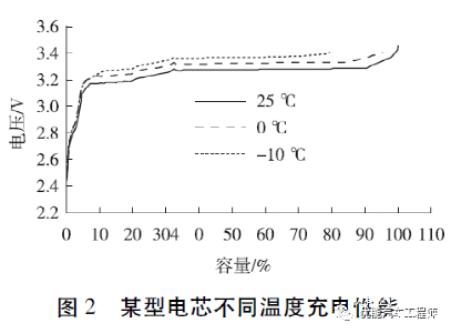 在低温环境中,动力电池电芯随着温度的不断降低,其充放电能力将快速下降,电池充放电容量也将快速减少。如图2所示,控制充电截止电压3.4V不变,测试某型电芯在不同低温下的充电容量:在0℃时,由于电芯DCIR增大,充电容量下降到常温(25℃)的95%,且比常温充电时间长约0.15h;而在低温-10℃时,由于电芯DCIR进一步增大,充电容量仅达常温(25℃)的75%,且比常温充电时间长约0.35h。