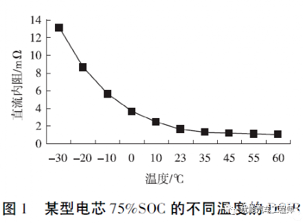 某型号动力电池电芯,75%SOC电量,放置在80~-40℃可调的温箱中进行测试,先将电芯保温24h,使其温度达到60℃,然后让电芯从60℃逐级降到-30℃,测其直流内阻(DCIR)从1.5mΩ升至13.5mΩ,后半段电芯DCIR上升速率非常大,如图1所示,随着温度逐步降低,其直流内阻将快速增加。