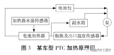 某车型原采用PTC水加热方式对动力电池进行加热,如图3所示。原系统存在热量损失较大、加热温差较大、加热过程电耗较大等缺点。