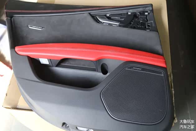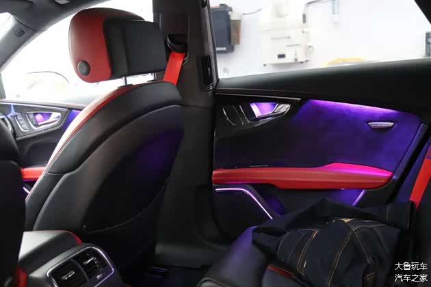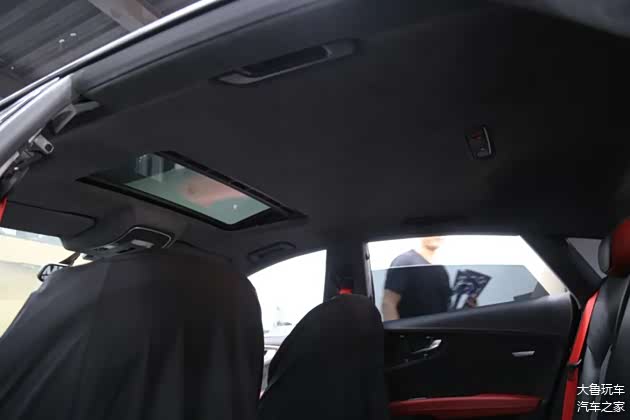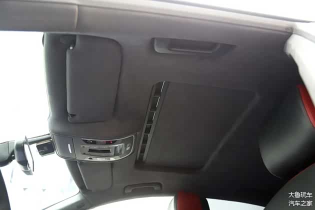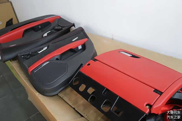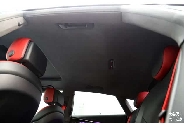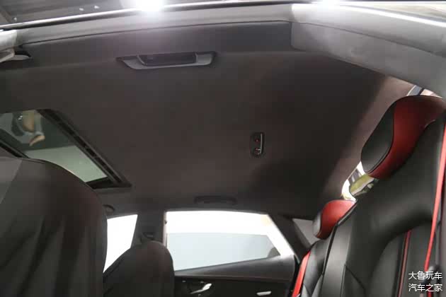 原车顶棚是白色的,升级成翻毛皮的之后变成了黑色,更有质感了。全车内饰是统一了黑红色颜色。