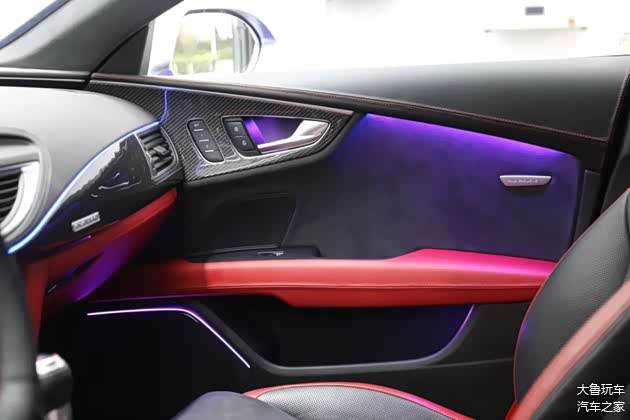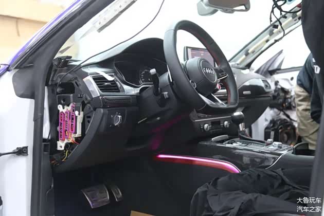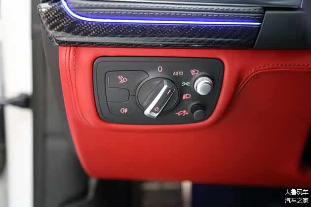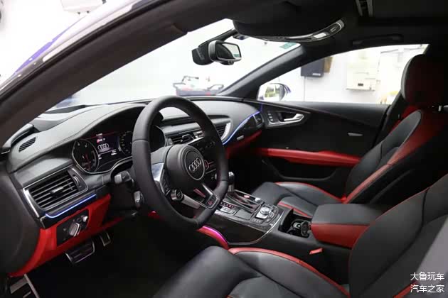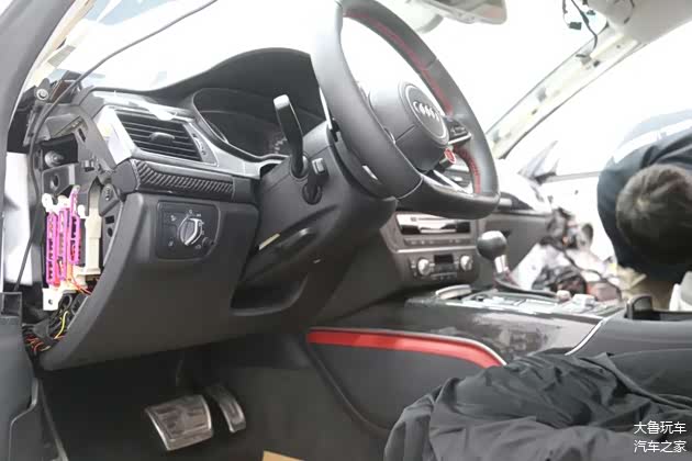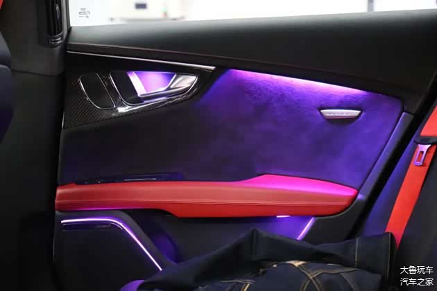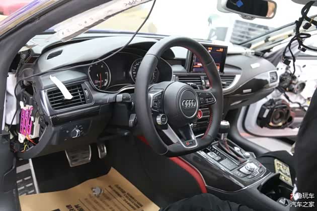 车顶做了一个翻毛皮的包覆,车里所有的木头的内饰全部更换为碳纤维的。黑红的内饰再搭配上红色的安全带,味道给足了。包括全车的氛围灯,还换了一个R8的方向盘,球形档把也换成了RS的,点火开关也变成了RS7的。仪表也换了一个RS7的仪表纸。