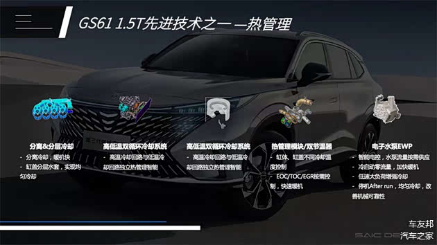 “黑科技”的加入,让热车不用等太久。上汽蓝芯GS61发动机配置高低温双循环冷却系统、热管理模块/双节温器和电子水泵EWP等技术,覆盖各种驾驶场景下的热管理需求。这不仅显著改善了冷启动排放和暖机速率,还能带来更好的经济性,可谓一箭双雕。
