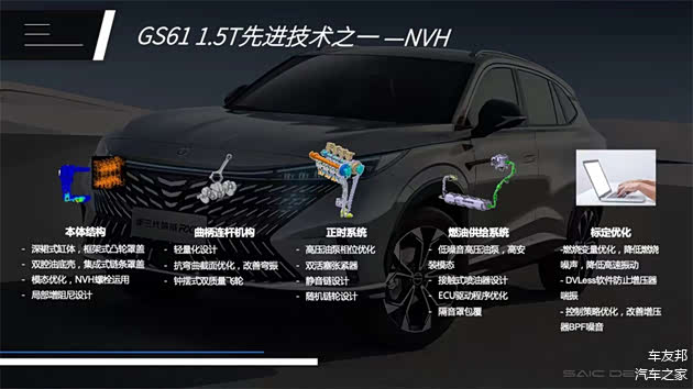 开车不仅需要速度与激情,当然还要享受与静谧。发动机降一分贝,隔音棉薄一毫米。上汽蓝芯GS61发动机在NVH优化上,工程团队也下足功夫。通过本体结构和曲柄连杆机构的轻量化设计,以及正时系统和燃油系统等关键部位声学包裹的应用,配以更精细的标定优化,怠速声功率国际领先,可为车内带来电动车般的静谧体验。