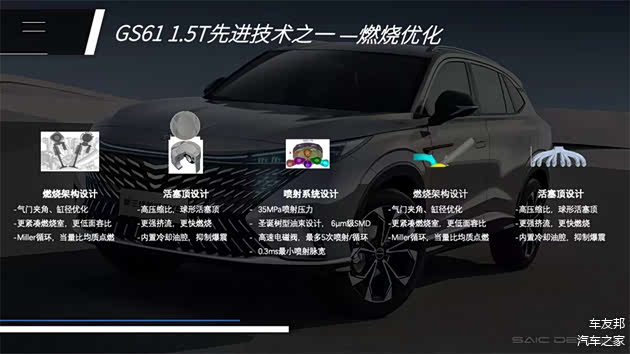 发动机输出功率,首先取决于汽油燃烧效率,发动机输出功率,首先取决于汽油燃烧效率,上汽蓝芯动力GS61 1.5T发动机采用了全新一代SGCS燃烧系统,配合350bar高压燃油喷射系统和电控可变截面涡轮增压器,迸发出300牛·米最大扭矩,实现188匹最大马力,是同级1.5T发动机中当之无愧的佼佼者。