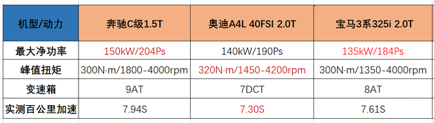 其实排量和性能并没有直接的关系,我们先来看一下同级别车型的动力对比。奔驰C级1.5T高功率版本,最大功率150kW/204Ps,峰值扭矩300N·m,功率已经超越了宝马和奥迪的2.0T低功率车型,虽然因为扭矩和基础排量原因百公里加速略微弱于奥迪A4L/宝马3系,但它零百7.94S的成绩对于一台1.5T发动机已经非常不错。技术方面是如何实现的呢?