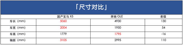 尺寸上,通过对比数据不难发现,国产宝马X5在车长车宽轴距上都超过了奔驰GLE,这也意味着其具有更加修长低趴的姿态与更大的空间天赋。而奔驰GLE却只在车高上胜出,优势并不明显。