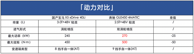 奔驰GLE同样搭载高低功率发动机,其中 350 4MATIC车型搭载2.0T涡轮增压四缸发动机,最大功率190kW,峰值扭矩370N·m,油耗8.9L/100km;而450 4MATIC车型使用2.5T六缸双涡轮增压发动机,最大功率270kW,峰值扭矩500N·m,并配备48V轻混系统,百公里加速时间为5.9秒,油耗8.7L/100km。传动系统均匹配9速手自一体变速箱,标配全时四驱系统。