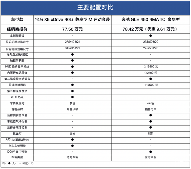 为了使结果更具参考性,我们选择两款价格接近一致车型,宝马X5 2022款 xDrive 40Li 尊享型M运动套装(经销商报价77.50万元),奔驰GLE 2022款 GLE 450 4MATIC 豪华型(经销商报价78.42万元)。