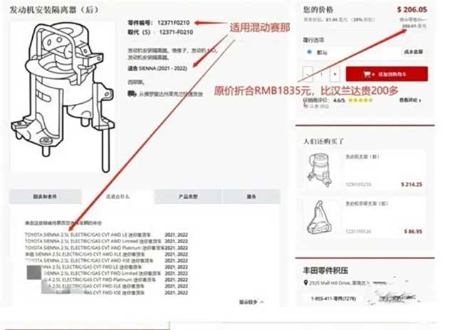 而使用同款动力(2.5LA25D发动机+电机)的混动赛那加速发动机噪音及震动感较22款汉兰达双擎小很多。根据车主反映,同样的问题在20-22年美国生产上市的混动汉兰达也存在,不过丰田早已经在2021年12月15日发出公告为车主已经进行免费质保更换,具体方案为更换新的发动机后机脚,新机脚零件编号为12371-F0210(赛那同款)。