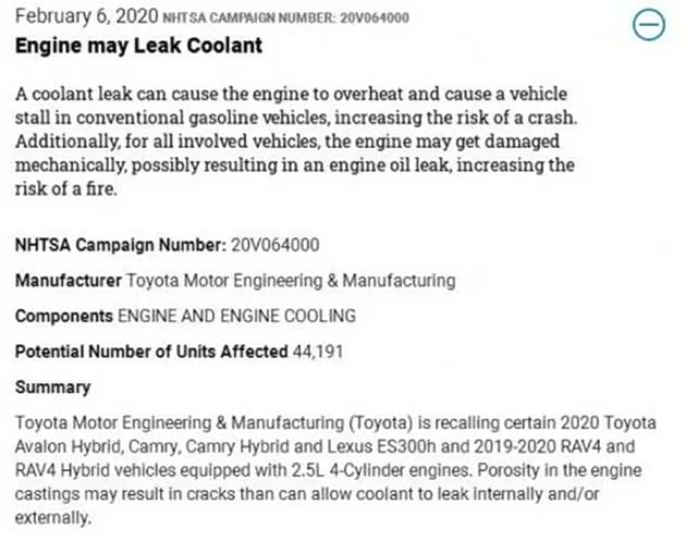 中国人向来痛恨双标,特别是涉及到汽车产品质量安全问题,如果区别对待,一定会被群起而攻之。2020年2月,丰田在北美地区召回4.4万辆可能存在冷却液泄露的汽车,车型涵盖亚洲龙混动、雷克萨斯ES 300h、凯美瑞、RAV4以及相关的混动车型。3月,丰田又在加拿大再次宣布召回15.8万辆旗下汽车。