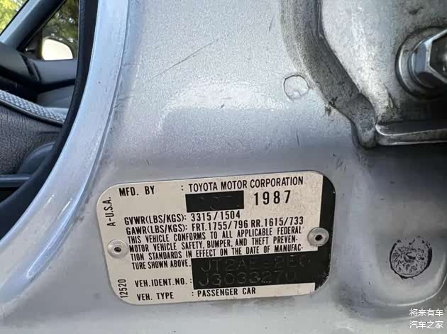 厂家的出厂标牌,日本制造,底盘型号AE92L,生产时间是1987年10月。美国市场销售的第六代丰田花冠来自三个工厂;日本制造的VIN 前缀是JT2,而美国NUMMI工厂制造的VIN前缀是1NX,加拿大剑桥工厂制造的VIN前缀是2T1。
