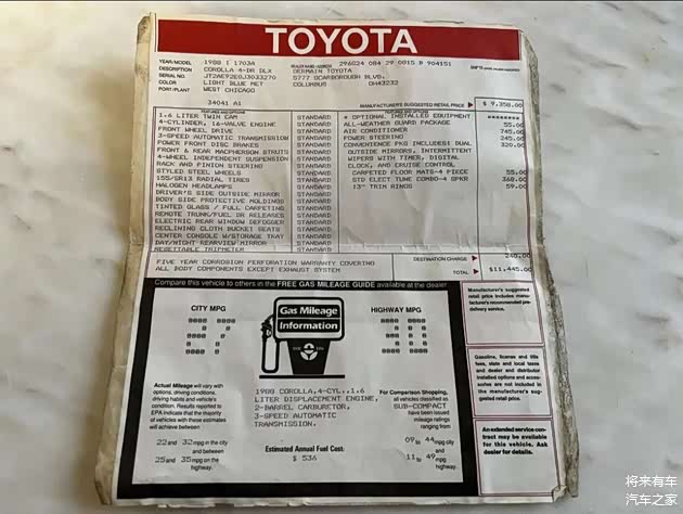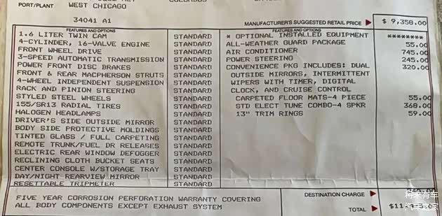 这辆车的配置单以及售价,标准配置的建议零售价格为9,358美元,标准配置有前助力刹车、后风挡除霜…… 这辆车上还有一些选装配置;745美元的空调,245美元的助力转向,320美元的便利配置(双速雨刷,电子表,定速巡航系统,双后视镜),368美元的四喇叭音响……加上运费最终的建议售价为11,445美元。 又想起了上世纪80年代中期北京流传的一个段子:“日本车便宜,丰田皇冠国外卖几千美元一辆……”