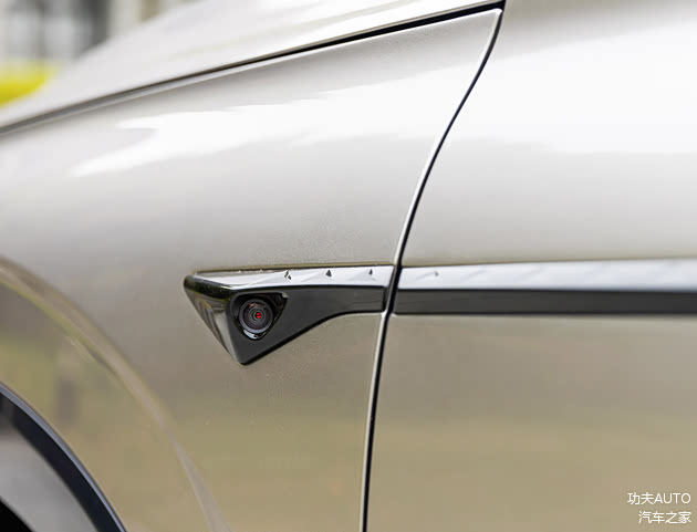 走到车身侧面,最抢眼的是溜背的设计和下方的秀气花瓣轮毂。侧面的腰线微微上扬,扶手处向外突出,后视镜上灰下黑。在后视镜下方黑色装饰条中隐秘地设置了两个摄像头,增加了安全性。把手也做了隐式处理,与整体的车身氛围融合一体。