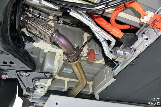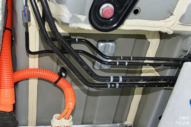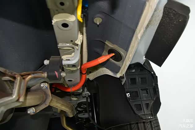 底盘没有任何树脂喷涂,防腐、隔热、隔音降噪要差一些,同时,这辆车的油路管线和高压线都暴露在外。