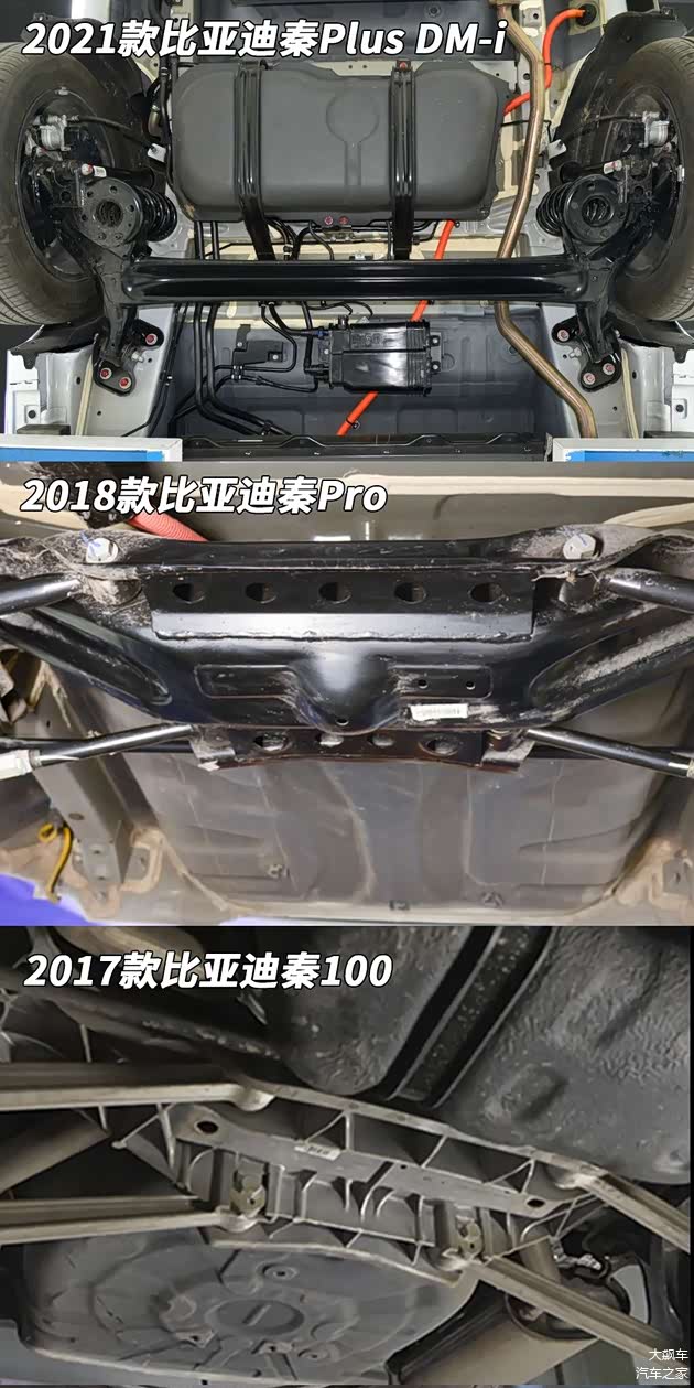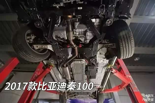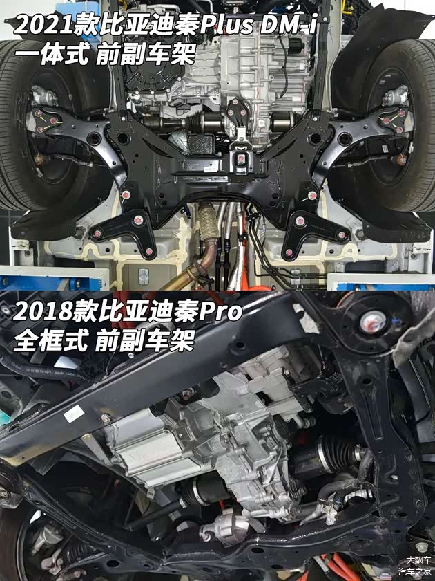 这辆车的前副车架为一体式结构,而之前我们拆过的秦Pro和秦100,前副车架则是正经八百的全框式副车架,能加强车身刚性,提升安全性。至于为什么变成一体式,应该还是出于成本的考虑。