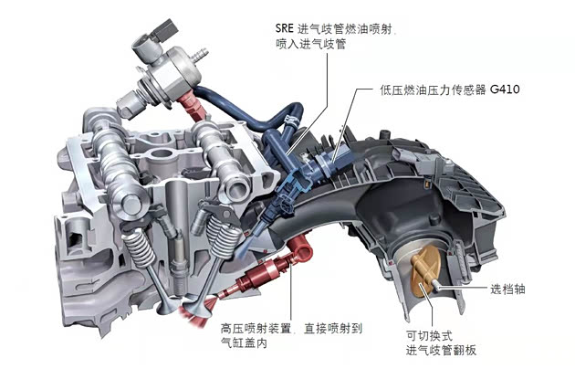 EA888 DKX采用了双喷射系统:TSI高压缸内直接喷射系统、SRE进气歧管燃油喷射系统。SRE进气歧管燃油喷射,可以让燃油油滴有充分的雾化时间并与空气混合,进而可以减少燃烧颗粒、二氧化碳的排放,降低油耗。不过,进气歧管燃油喷射系统,无法“精确控制”瞬时供油量,而这正是TSI高压缸内直接喷射系统的优点。EA888 DKX发动机管理系统,可以根据发动机温度、负荷和发动机转速,在SRE单喷射、高压单喷射、高压双喷射、高压三重喷射等几种喷射模式下智能切换。