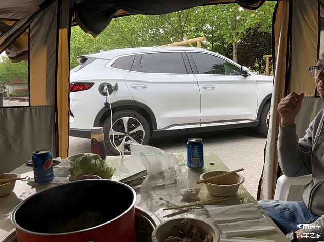 为了测试这款车,小编自带火锅,从比亚迪宋PLUS DM-i车后引出插线板,来了一次帐篷火锅。“这款车有逆向放电功能,就相当于一个移动的大充电宝,随车自带插线板,一头接在车子的充电口上,另外一头就是插线板,上面除了普通接口外,还有16安的接口,就是空调那种大接口。可以供3000瓦用电器使用6个小时,如果没电了,还可以着车,让发动机给电池充电。”杨先生说,有这个功能,户外露营用电就不是问题了。