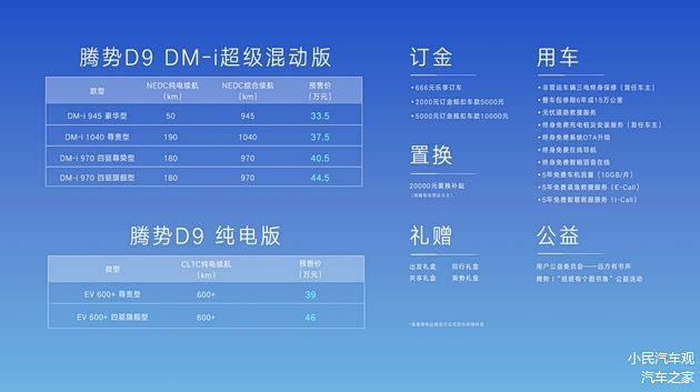 同时,腾势针对D9推出丰富的臻享豪华预定权益,预售期间下订D9的用户,可臻享多项豪华预定权益:权益一:享3档订车模式,让用户零风险享受大额现金权益。权益二:享4大用车保障,和5大智联在线,确保用户后期用车无忧。权益三:置换D9新车享20000元置换补贴,以最大诚意回馈每一位忠实用户。权益四:大礼随处可见,订车礼盒拿到手软。权益五:成功支付意向金的用户,可共同参与品牌各类公益活动项目。