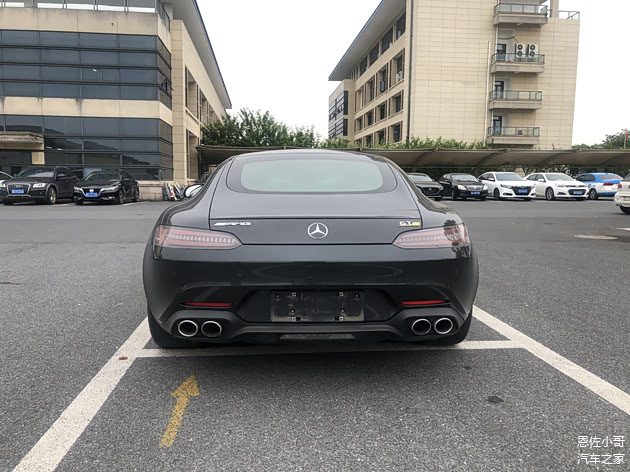 车尾线条非常优雅,大角度的倾斜,两侧部分明显的外扩,显得很圆润饱满。车尾上方有一个主动式的扰流板,可以根据驾驶模式、速度自动调整开启角度。当然,也支持手动控制。扁平化的条形尾灯将车尾的视觉效果向车身两侧延展,尾灯也是全LED光源。底部最显眼的还是那外露的四出排气,气势很足。这台AMG GT后备箱有一定实用性,可以放个登机箱,容积175L,在双门2座跑车里算可以的。