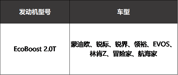 EcoBoost 2.0T系列发动机,在福特旗下的多款车型都有搭载,包括:蒙迪欧、锐际、锐界、领裕、EVOS,还包括豪华品牌林肯旗下的林肯Z、冒险家、航海家等车型。