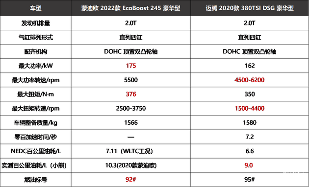 两款发动机,从性能参数对比看,福特EcoBoost 2.0T发动机在最大功率、最大扭矩输出上占有一定优势,不过对于最大功率转速(5500rpm)、最大扭矩转速(2500-3750rpm),相对大众EA888发动机“略窄”一些。油耗方面,2022款蒙迪欧标定的WLTC百公里油耗是7.11L,2020款迈腾标定的NEDC百公里油耗是6.6L,由于WLTC工况更加严格更加贴近实际工况,所以油耗方面当前还无法直接比较——待2022款蒙迪欧积累一定的用户数据,阿甘再补充油耗的对比。不过在适应性方面,蒙迪欧可以加注92#汽油,略胜一筹。