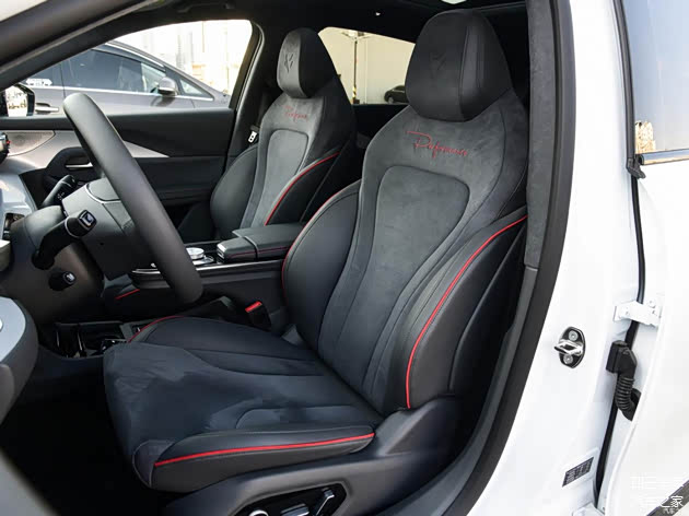 极狐阿尔法S配备有一套运动风格的皮/翻毛材质混搭座椅,红色线条的点缀进一步强调了运动感;实际来看,这套座椅的包裹性的确值得肯定,宽大的侧翼能够在过弯时给予用户身体一个良好的支撑。同时,这套座椅的功能性也不赖,主驾驶位带加热、通风、电动调节、记忆等功能,而副驾驶位也有加热、通风、电动调节。
