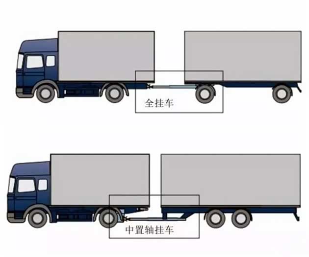 ②中置轴挂车的牵引装置是固定的,不能上下移动,不带转向架;全挂车的前轴带转向功能,牵引装置支持上下左右摆动。