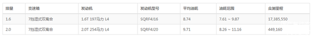 2.0T车型和1.6T变速箱一致,都是7挡湿式双离合,但发动机达到了254马力,发动机型号AQRF4J20,平均油耗9.71,油耗范围在8.26-11.16,众测里程449,160。从这两组数据可以表面90%车主是1.6T车型,2.0T油耗相对较高。