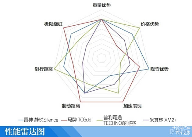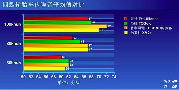 ▼ 在太平洋汽车的轮胎横评中,雷神静悦对比几大品牌中端胎有明显静音优势。