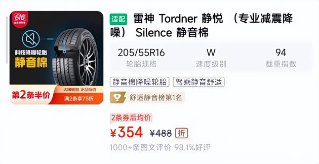205/55 R16 94W XL(XL指负荷增强型轮胎)某虎价488元/条,两条均价354元/条。