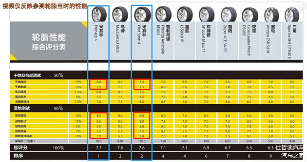 ▼ 车比得的轮胎横评里,米其林的静音舒适胎浩悦4 Primacy 4和性能胎PS4同台PK,两者性能十分接近,仅湿地侧滑一项明显落后,但舒适性, Primacy 4领先一截,怀疑米其林把, Primacy 4的静音技术去掉就成了价格更贵的PS 4(手动狗头)。