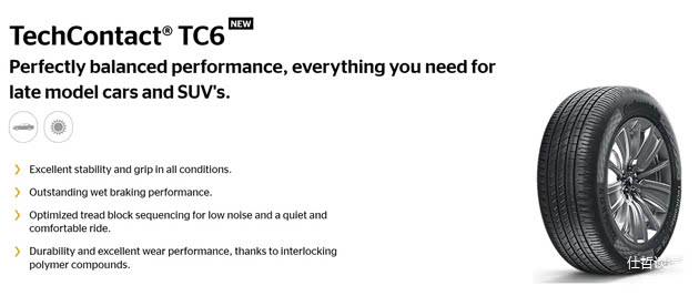 均衡之选,TC6是德国大陆马牌的中端全能均衡型轮胎,主打高速稳定性、湿地刹车和静音,耐磨指数420,兼顾使用寿命,一改CC6等马牌老型号不耐磨的老印象。