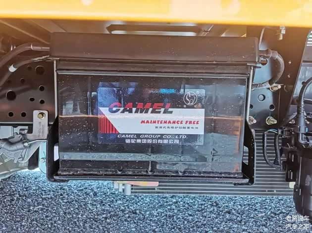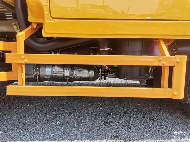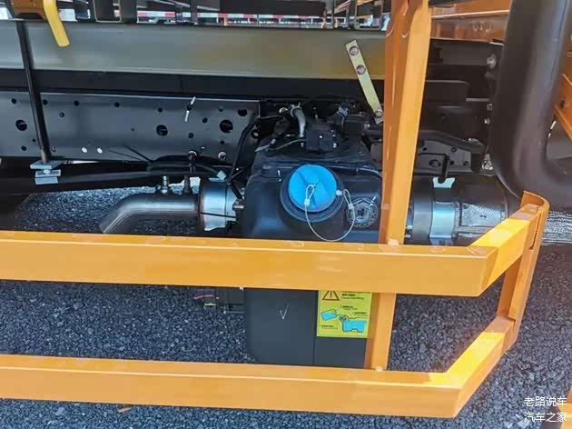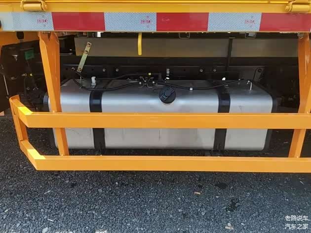 车架左侧布置的是电瓶和83L油箱,右侧布置的是空滤和尿素箱,尾气后处理装置布置在车架右侧下方。车辆底盘做工精致,车架左右都有黄色的钢制防护栏进行保护,也让整车造型看上去更为规矩美观。相对来说车架右侧的空间有一定空余,必要时可以利用车架上预留的孔位加装工具箱。上装除了图片上这种栏板式车厢之外,厂家也生产装配多种厢式车厢供用户选择。