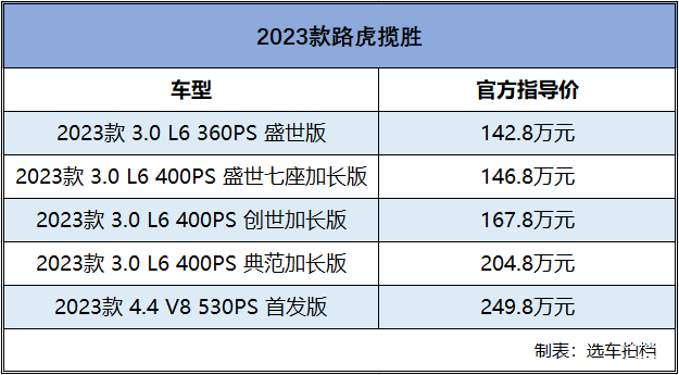 6月20日,2023款路虎揽胜上市,新车共推出5款车型,售价为142.8-249.8万元。与今年4月新车上市相比,新增标准轴距车型盛世版以及 创世加长版。