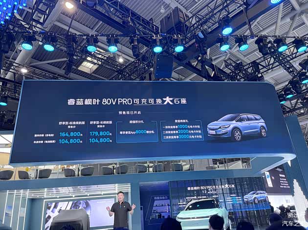 在 2022 重庆车展上,睿蓝品牌的枫叶 80V PRO 正式亮相并开启预售,新车含电池的预售价为 16.48-17.98 万,车电分离版本的预售价均为 10.48 万。