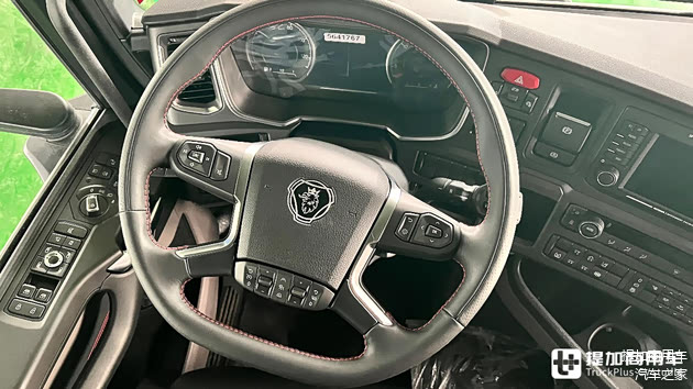 进入内饰。斯堪尼亚NTG卡车的内饰相信大家都很熟悉,略带平底的方向盘、环抱式仪表台以及数字和机械结合的仪表盘,都体现了斯堪尼亚一流的设计水平,使用起来赏心悦目,十分顺手。