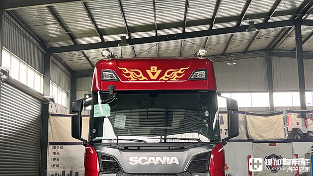 作为一款中国限量版卡车,车辆当然要足够具备中国特色,通过车辆的涂装就能感受到。首先,车辆采用了极具激情的红色作为涂装底色,对应了中国的代表色,让车辆具备了激情、动感的视觉效果。本车选用的驾驶室型号为CS20H,代表高顶、长度约2米,是目前国内的斯堪尼亚S系卡车可选的最大驾驶室。