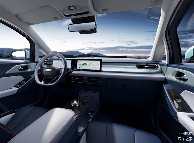 几何E在内饰的设计上并没有选择沿用此前几何A、几何C的设计,最大的改变是追随时下潮流使用了双联屏的设计,两款屏幕的尺寸均为10.25英寸,有助于车内科技感的营造。撞色内饰也为新车增添了时尚气息。在仪表台两侧有名为“律动之丘”的高位立体声扬声器,视觉效果极佳同时可以提升音质表现。中控台的上方还配有“灵感之光”交互功能灯,车机和驾乘者交流时它会通过色彩以及光效的变化提示用户车辆解锁、充电等等状态,同时具备迎宾、欢送以及呼吸灯效功能,非常炫酷。