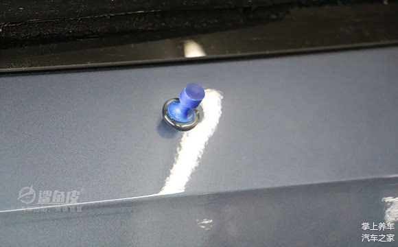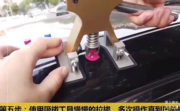 第三步用拉锤或者拉拔器,去拉动粘片的头部。需要注意的是拉拔器两个脚是搭在漆面上借力,所以不要放在偏软的位置,避免压出凹陷;