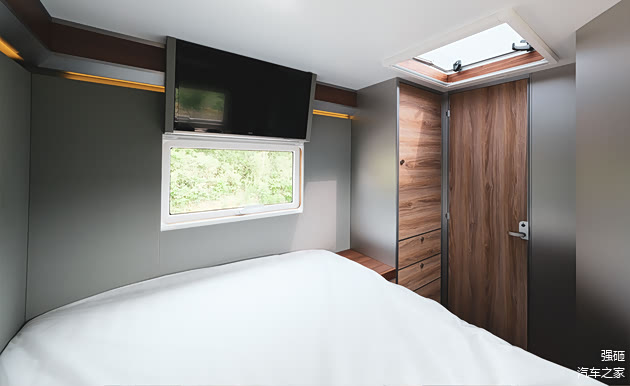 车头主卧区,采用独立卧室设计,两侧配备对流采光窗,中央顶部装载一扇天窗,下方设一张1960*1450mm尺寸双人床,床头设有衣橱、床头柜、电源插座、照明设施等功能。车内休息空调系统则配置有3套2.6kw直流变频单冷空调、2套进口4kw柴油暖风锅炉取暖系统、暖气片取暖系统以及一部带花粉过滤和排风系统的正压式新风系统。全方位使车内空气、温度都适宜用户生活。